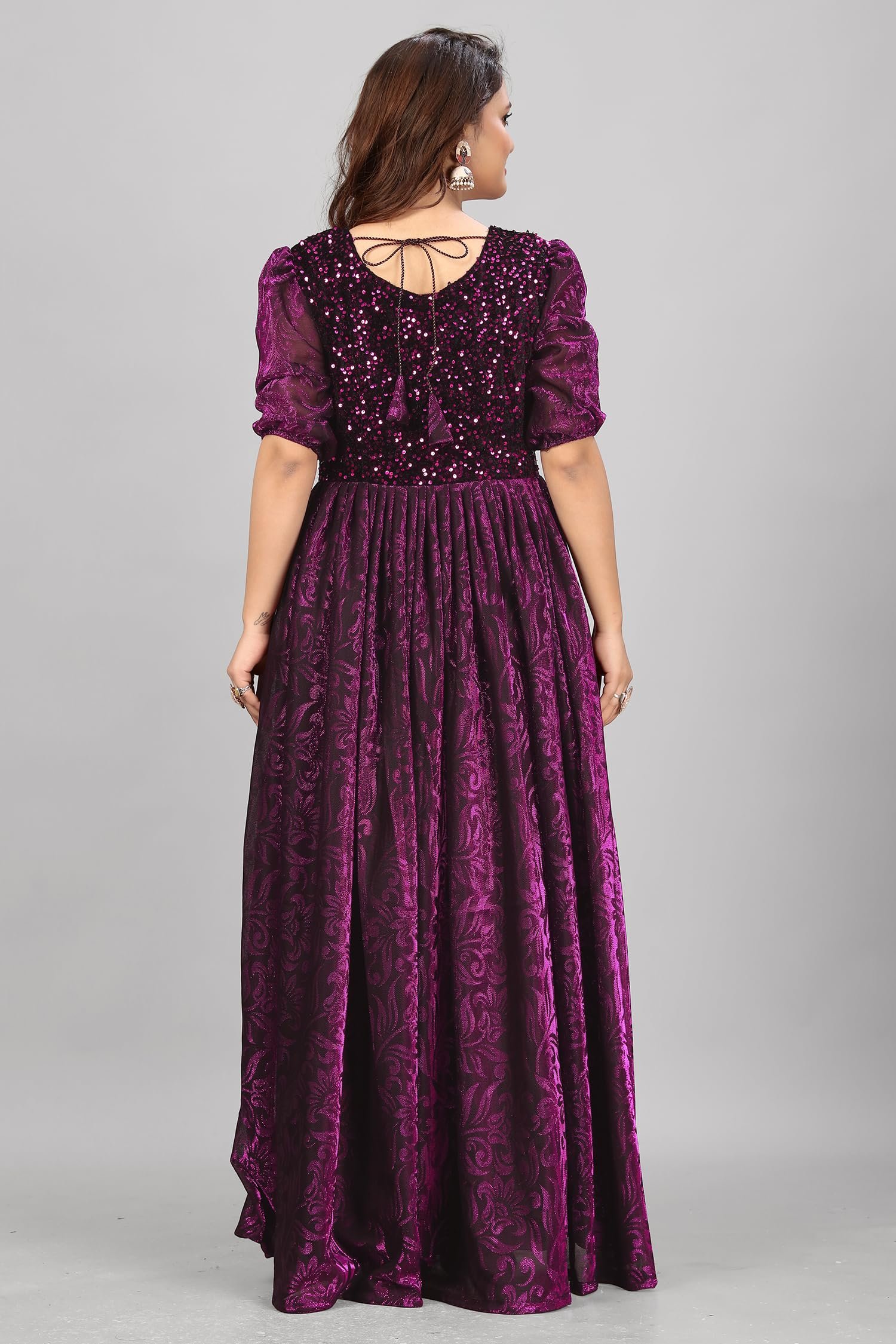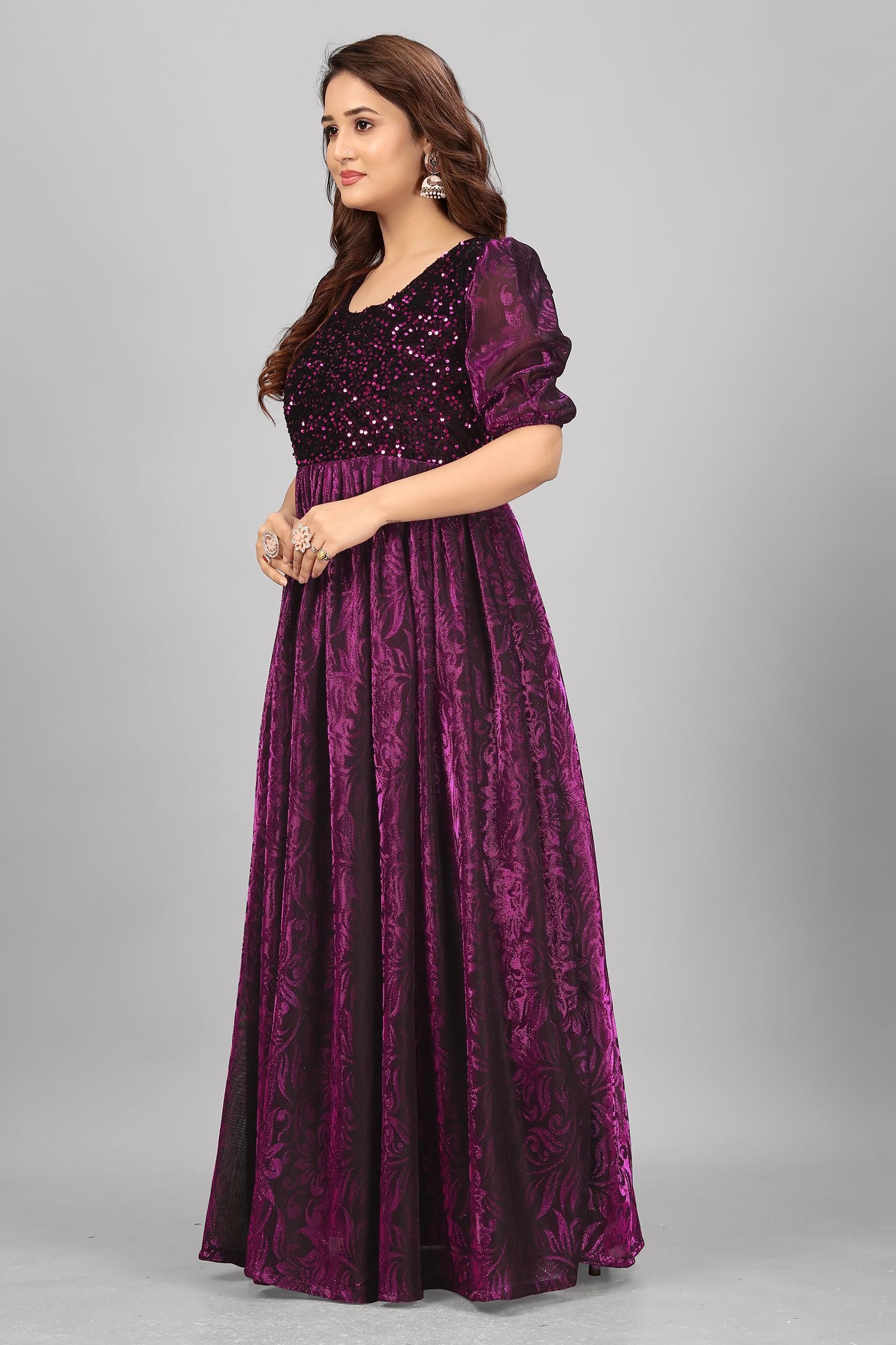 Make a stunning entrance in this exquisite floor-length gown that seamlessly blends elegance with contemporary style. The dress features a mesmerising combination of deep red and black, with an intricate floral emboss print throughout the fabric. The bodice is adorned with sparkling sequins that catch and reflect light beautifully, while the puff sleeves add a touch of romantic charm. Crafted from premium velvet material, this Anarkali-style gown offers both comfort and sophistication. The flared silhouette creates graceful movement with every step, while the maxi length ensures a dramatic sweep. The gown’s design includes thoughtful details like a flattering scoop neckline and delicate tie-back closure. Perfect for special occasions, festivities, or formal events, this gown promises to make you stand out with its luxurious appeal. The rich colour palette and detailed embellishments make it an ideal choice for evening wear or celebration attire.