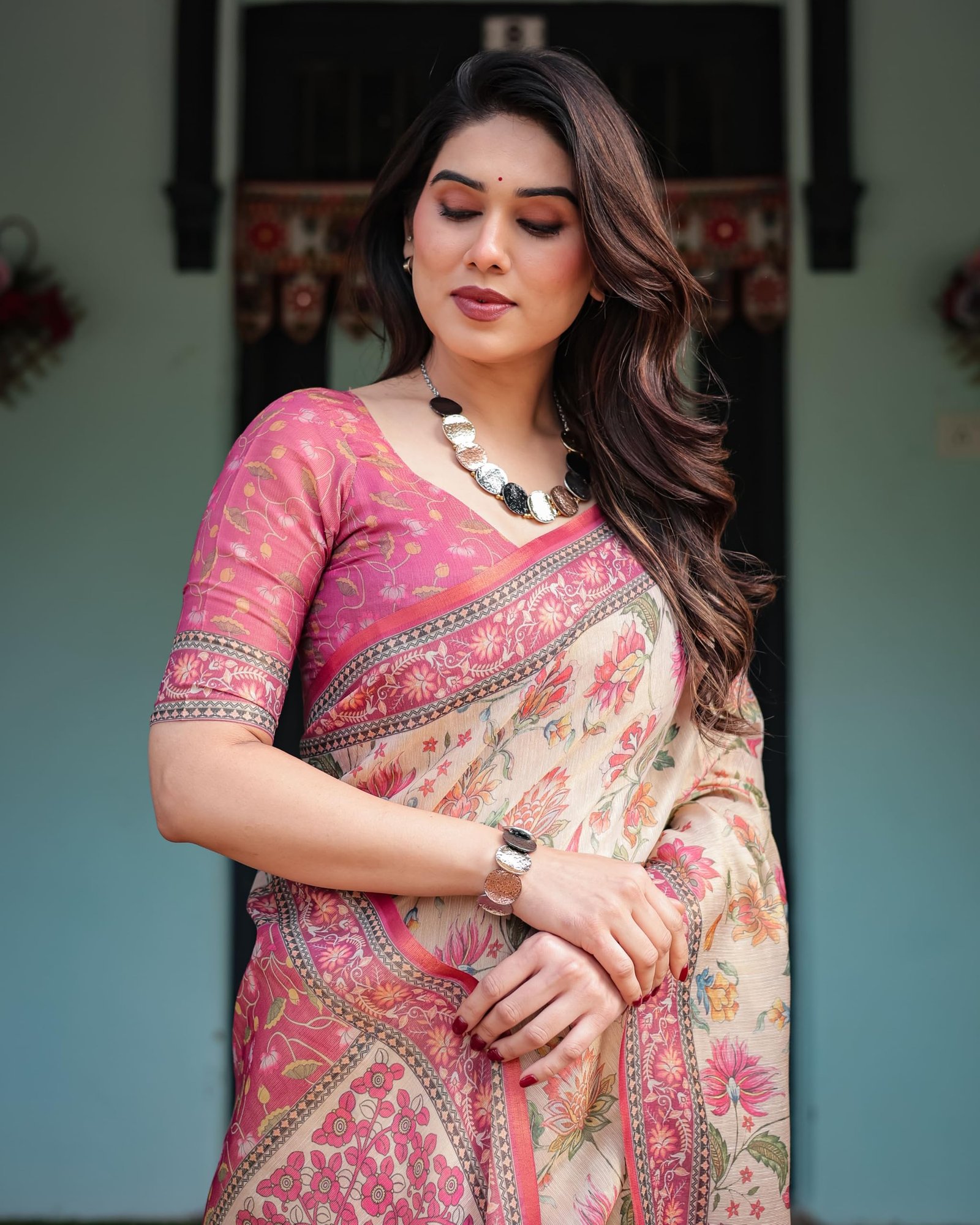 - Traditional and Trendy Design: A beautiful fusion saree, this traditional saree with a trendy floral print saree design is crafted from handloom cotton linen. Its vibrant yet elegant look makes it suitable for both casual saree outings and festive celebrations.