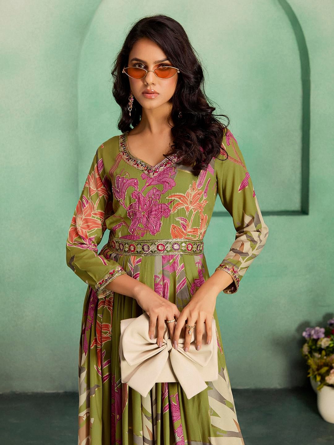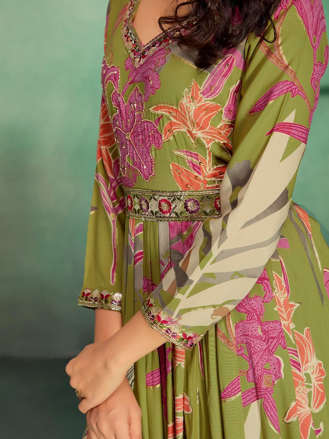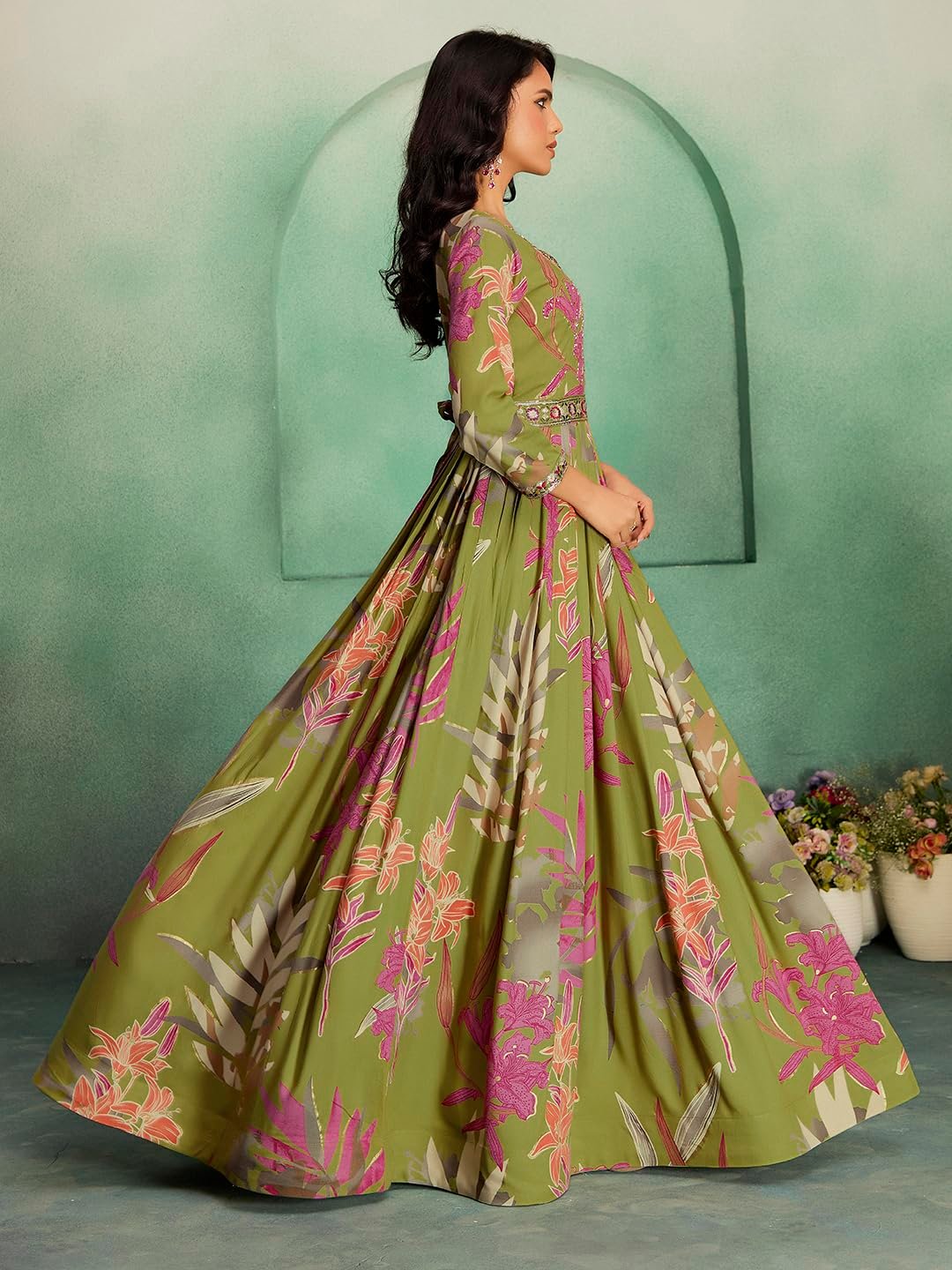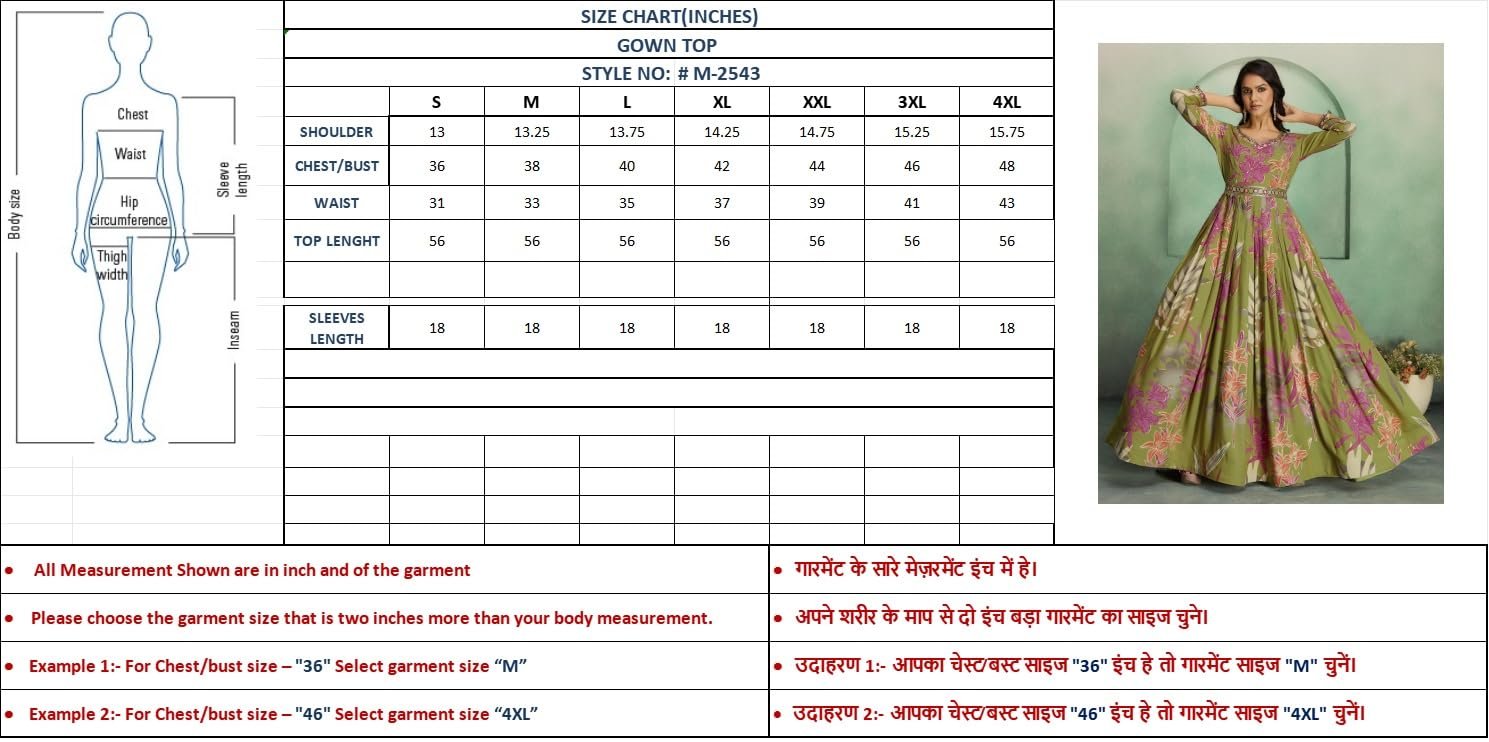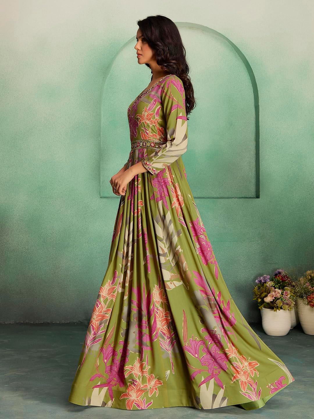- STAND OUT FROM THE REST: Keeping in mind the latest fashion trends, this designer Long Gown is made to help you make a bold fashion statement. The Mehndi(Green) and multi-color long Gown dress for women’s Latest Design pattern highlights the color of your choice which is accented further.