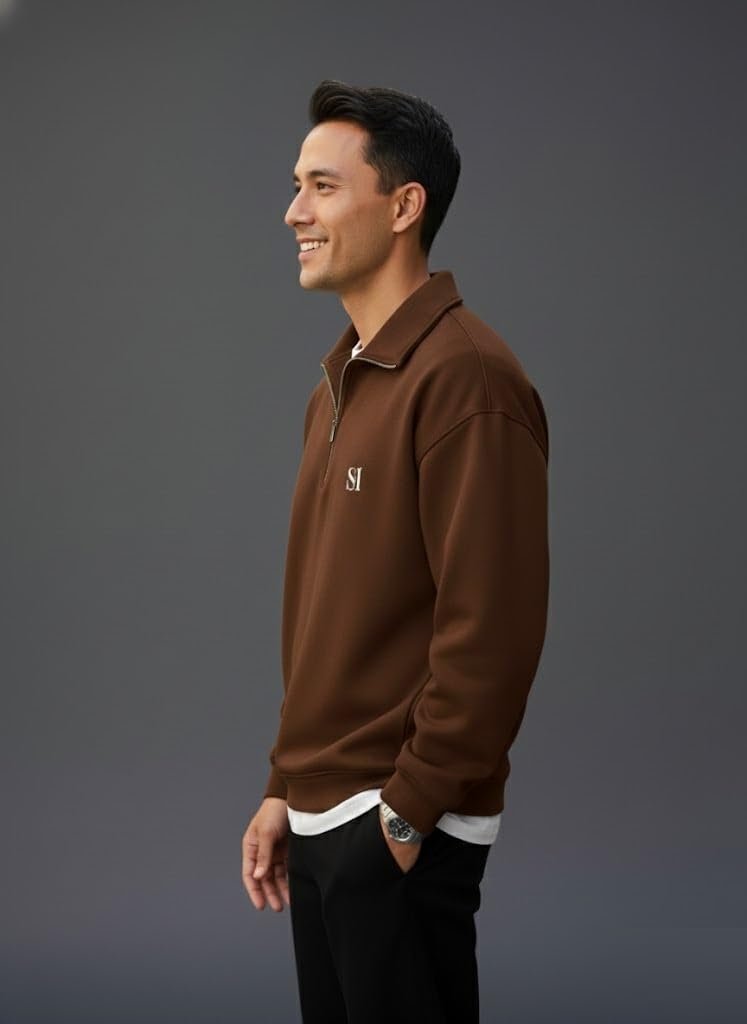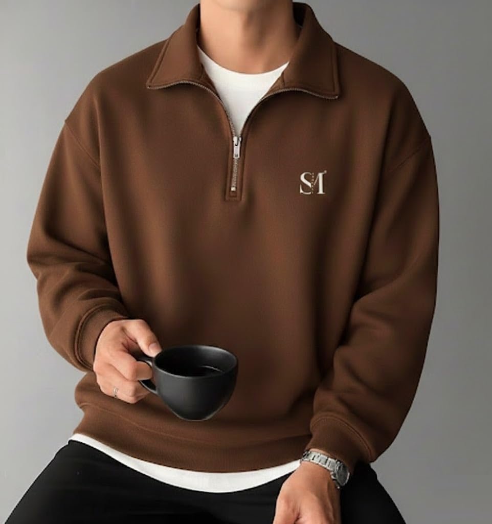 SMOWKLY Men’s Collar Chain Cotton Fleece Sweatshirt for Men | Breathable,Half Zipper & Full Sleeves All Day Wear Sweaters | Warm Hoodie for Gym, Travel & Casual Winter Wear (1686_BRN_M) Brown